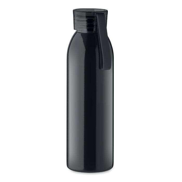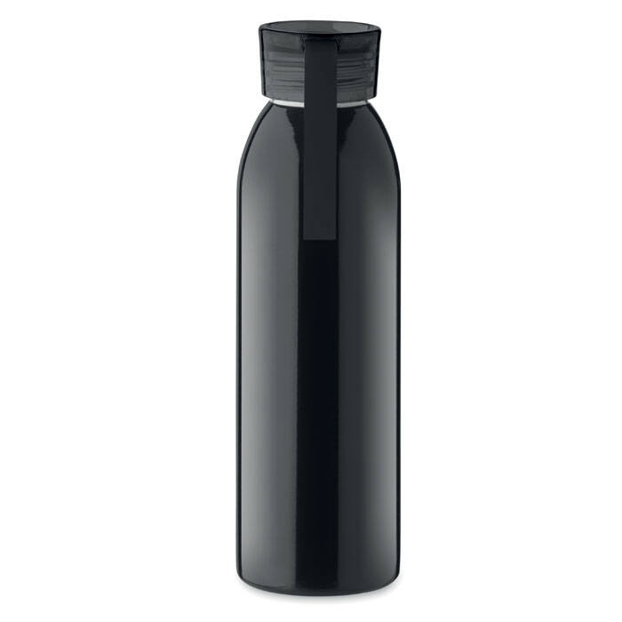 Jednościenna butelka ze stali nierdzewnej z pokrywką z PP i silikonową zawieszką.