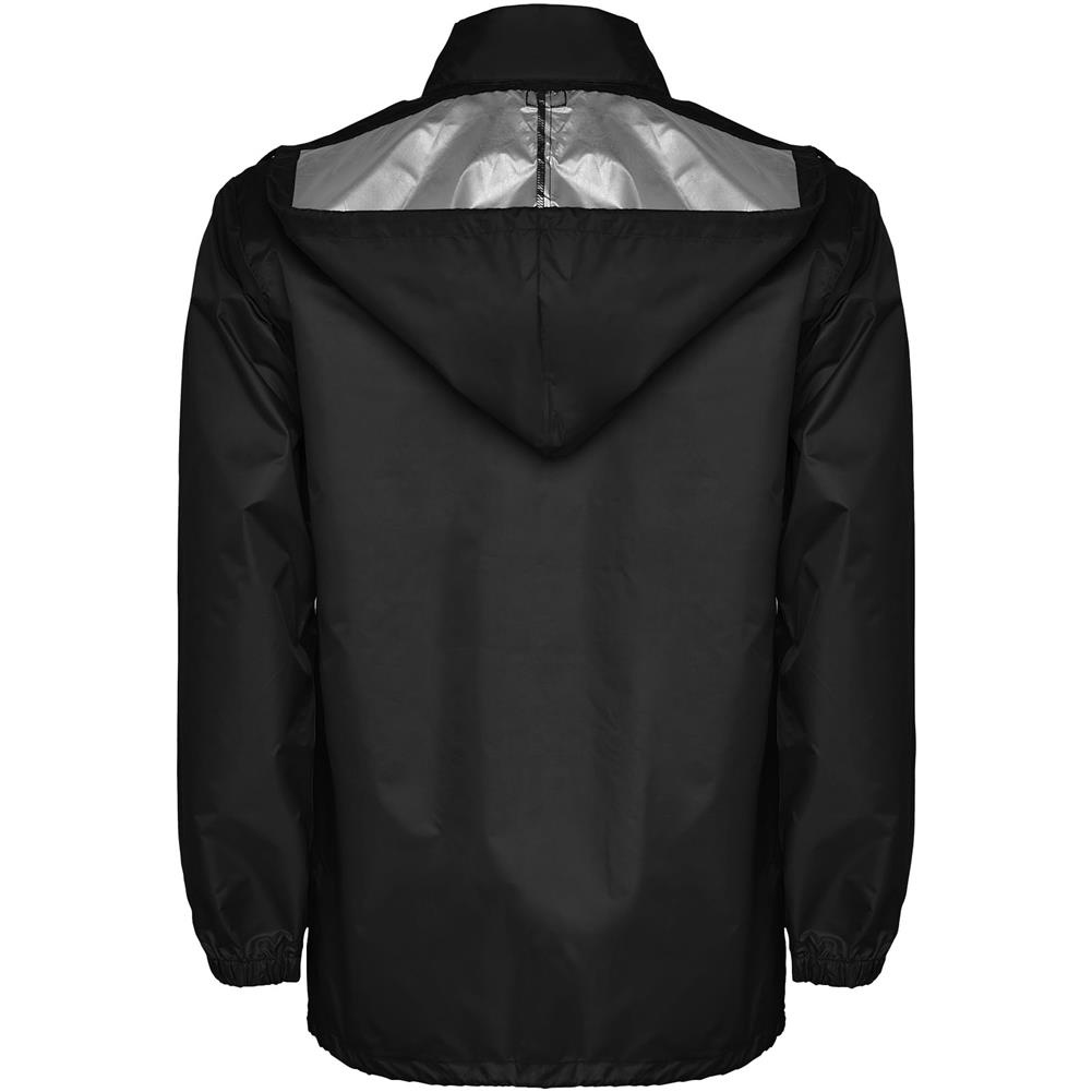 Wodoodporny płaszcz przeciwdeszczowy. Wysoki kołnierz i składany kaptur z regulowanym sznurkiem. Zamek błyskawiczny z przodu z dopasowanym ściągaczem. Dwie boczne kieszenie z klapką. Elastyczne mankiety. Elastyczny pasek wewnątrz kieszeni do składania i przechowywania. Model wodoodporny.