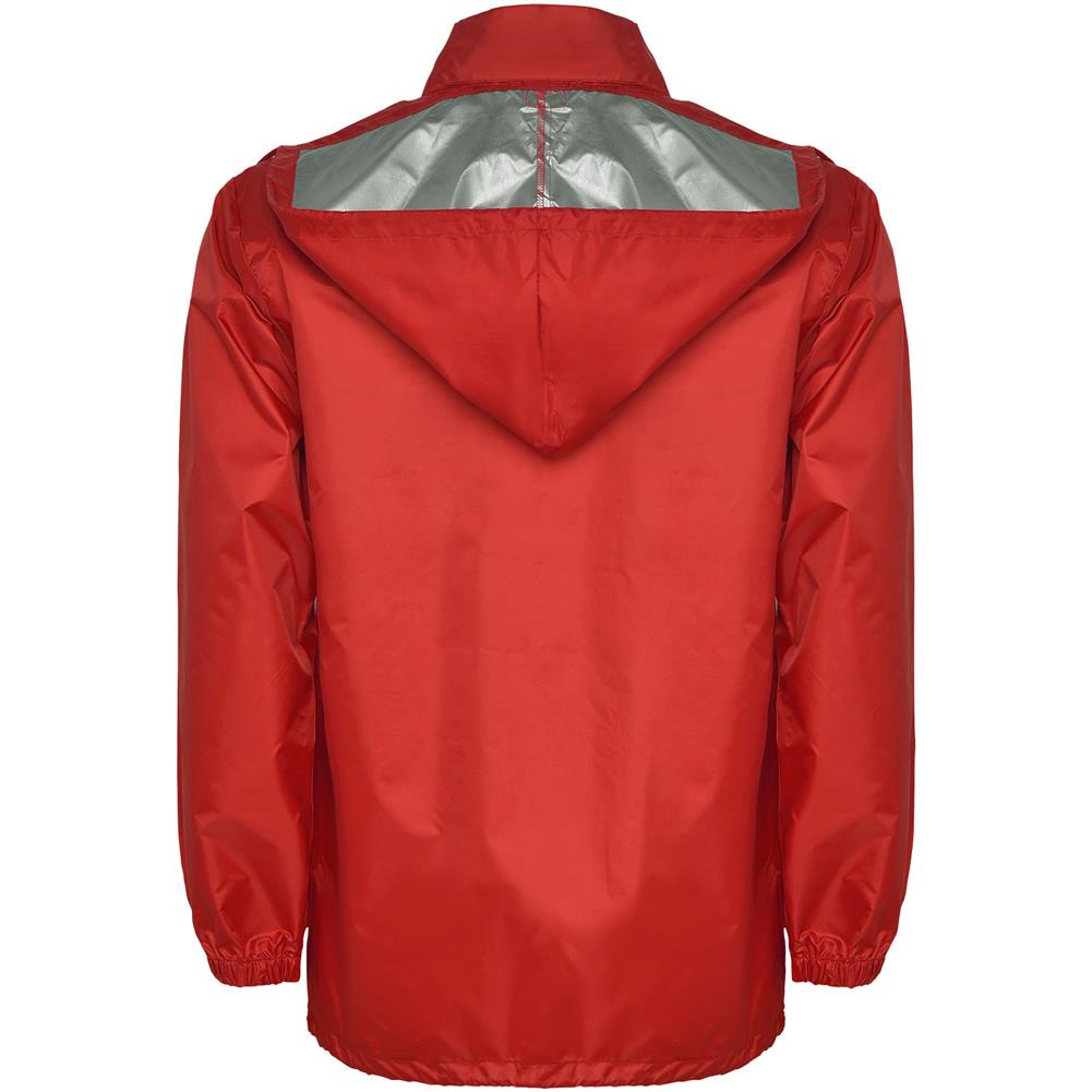 Wodoodporny płaszcz przeciwdeszczowy. Wysoki kołnierz i składany kaptur z regulowanym sznurkiem. Zamek błyskawiczny z przodu z dopasowanym ściągaczem. Dwie boczne kieszenie z klapką. Elastyczne mankiety. Elastyczny pasek wewnątrz kieszeni do składania i przechowywania. Model wodoodporny.
