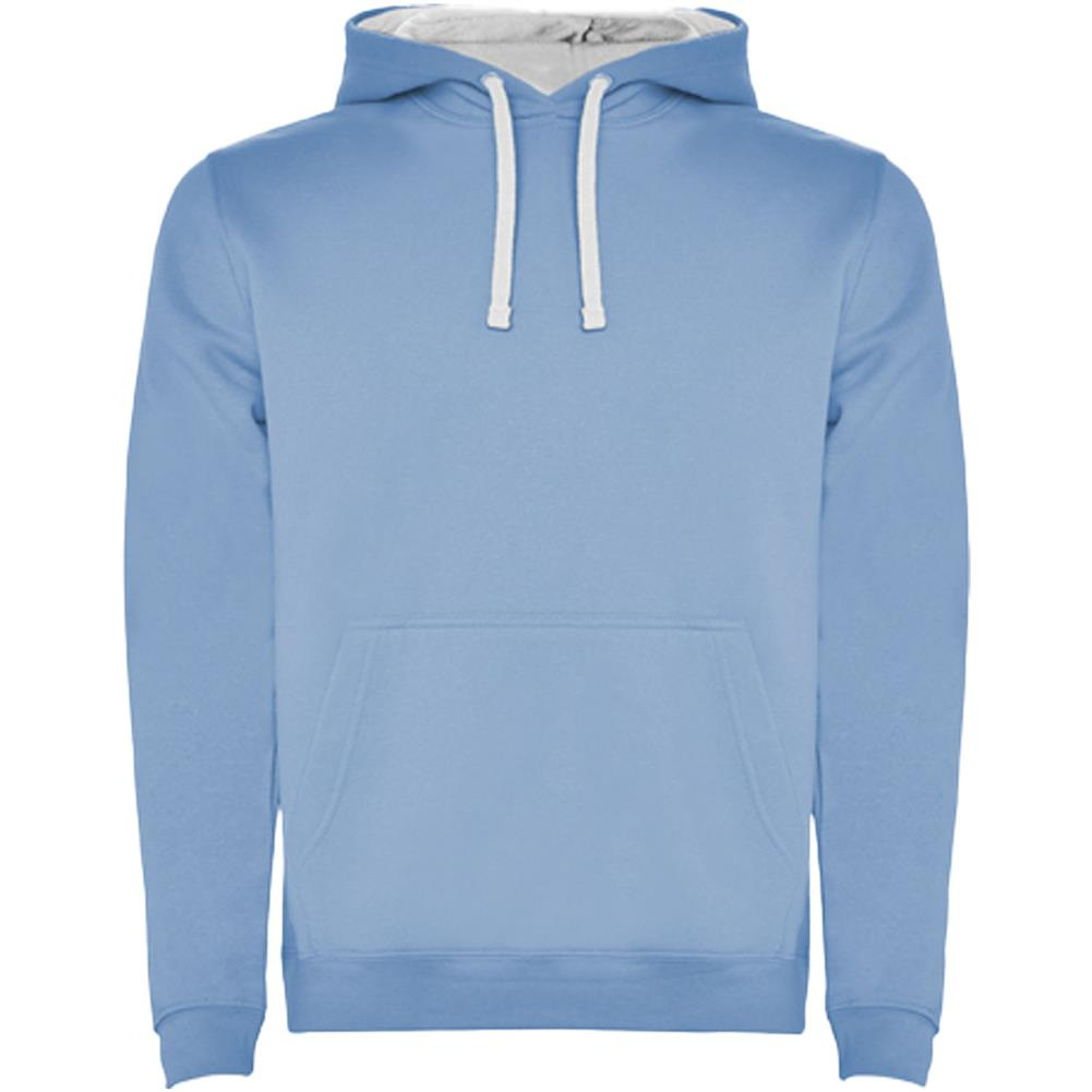 Dwukolorowa bluza z kapturem z podwójnego materiału. Wzmocnione kryte szwy w kołnierzu i kieszeń kangurka. Ściągacze 1x1 z elastanu w mankietach i pasie. Usuwalna metka.