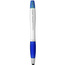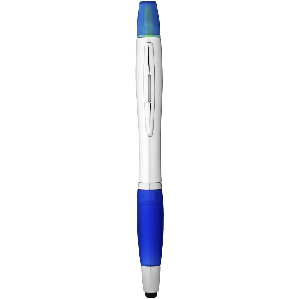 Długopis ze stylusem i zakreślaczem, mechanizmem obrotowym, srebrnym korpusem oraz kolorowym, miękkim w dotyku uchwytem.