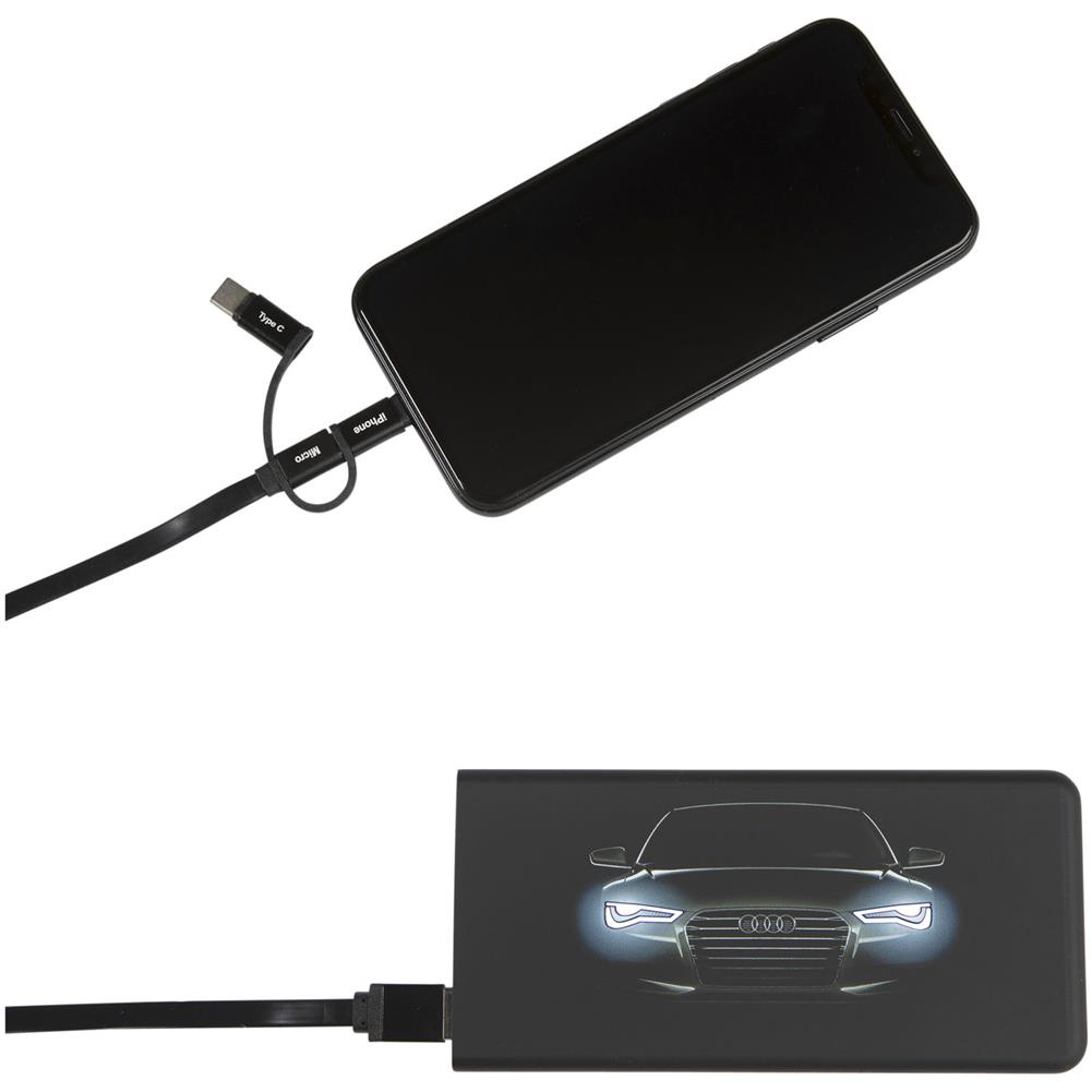 Ultracienki i ultralekki gumowany powerbank z podświetlanym logo wyposażony w aluminiowy kabel 3-w-1 (USB typu C, Android, iPhone). Urządzenie rozświetla się po dotknięciu dzięki funkcji „shake”. Logo może świecić nawet przez 20 dni bez konieczności ładowania baterii. Możliwość wykonania nadruku digital. Pojemność: 5000 mAh. Podwójne wyjście DC: 5V/2A i 5V/2A do szybkiego ładowania. Wejście DC: 5 V/2A mikro-USB. Waga netto: 110 gramów. Wymiary: 138 x 66 x 8,5 mm. W zestawie znajduje się pudełko upominkowe wykonane z papieru z recyklingu.