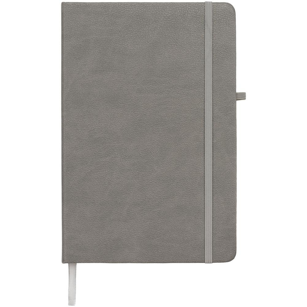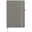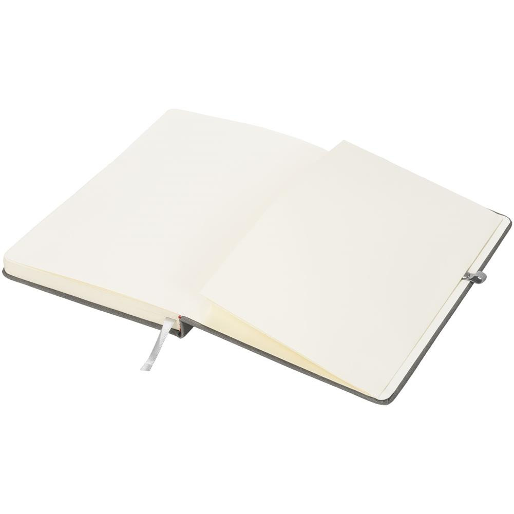 Notes ma zamknięcie na gumkę, pętelkę na długopis, zakładkę ze wstążki oraz kieszeń na wewnętrznej stronie tylnej okładki.
