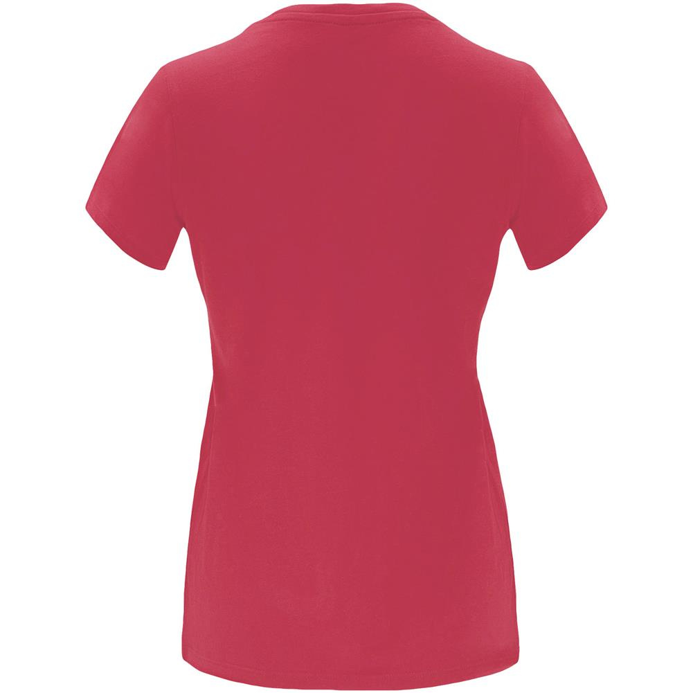 Damska dopasowana koszulka z krótkim rękawem. Okrągły prążkowany dekolt 1x1. Wzmocnione, kryte szwy na kołnierzu. Usuwalna metka.