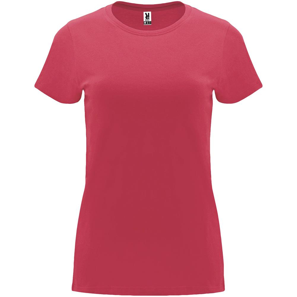 Damska dopasowana koszulka z krótkim rękawem. Okrągły prążkowany dekolt 1x1. Wzmocnione, kryte szwy na kołnierzu. Usuwalna metka.