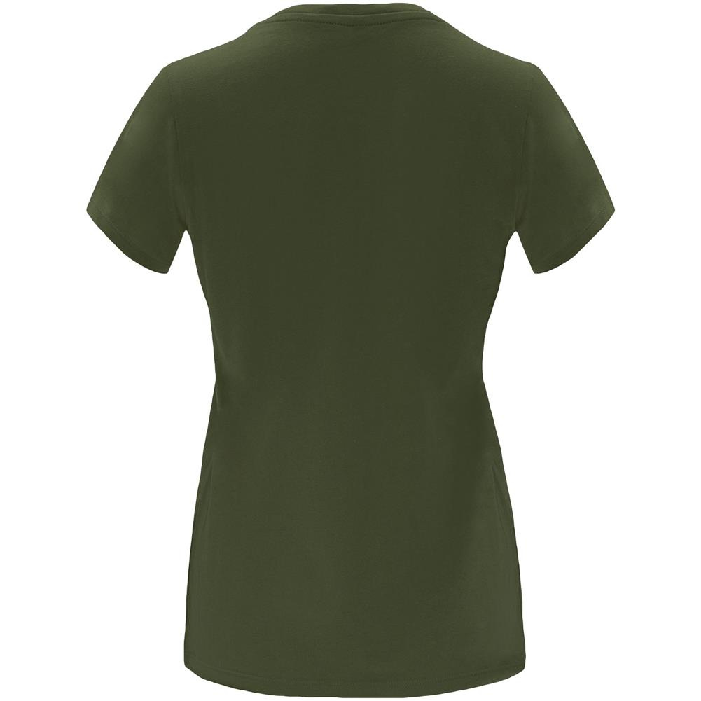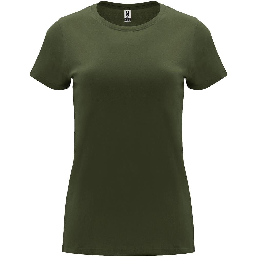 Damska dopasowana koszulka z krótkim rękawem. Okrągły prążkowany dekolt 1x1. Wzmocnione, kryte szwy na kołnierzu. Usuwalna metka.