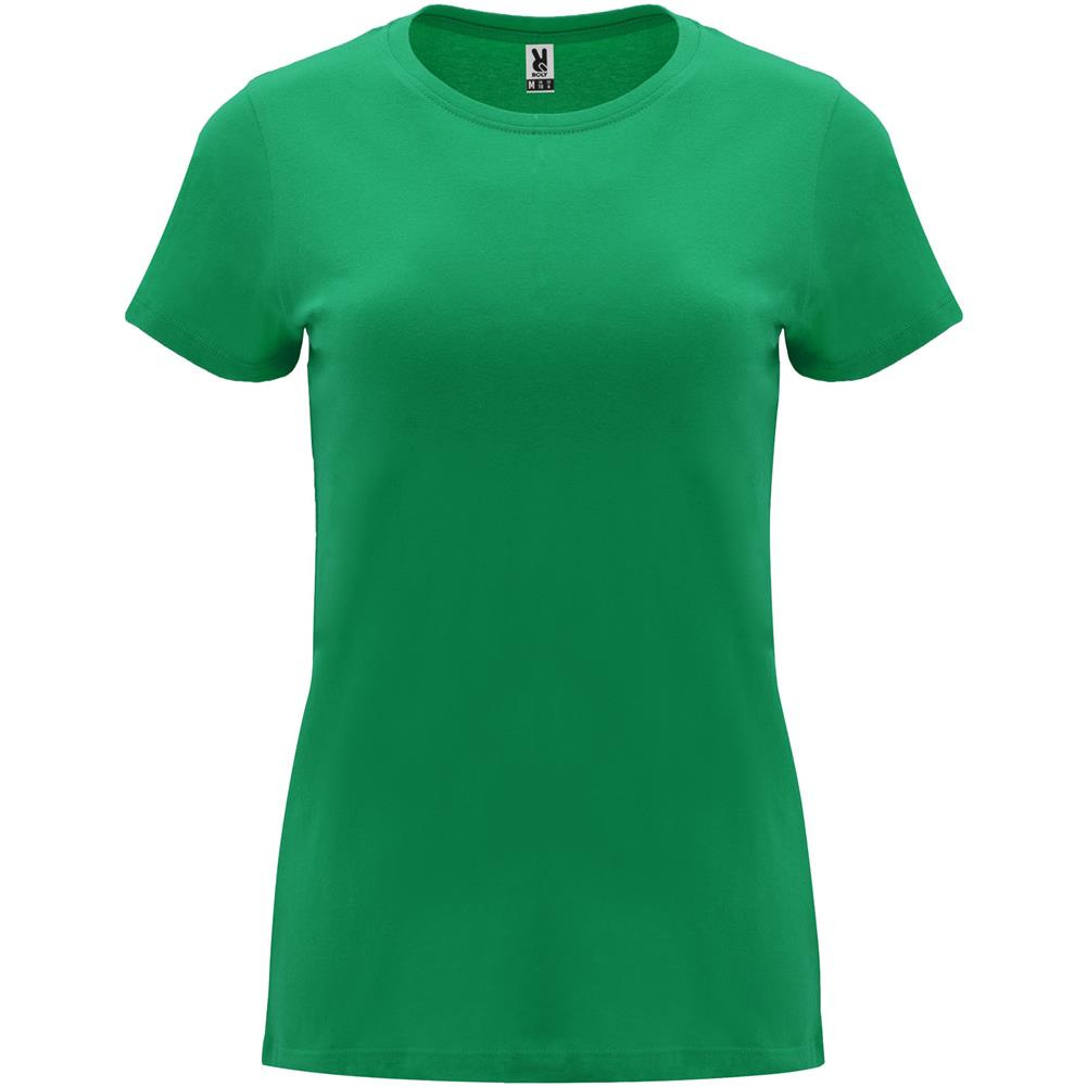 Damska dopasowana koszulka z krótkim rękawem. Okrągły prążkowany dekolt 1x1. Wzmocnione, kryte szwy na kołnierzu. Usuwalna metka.