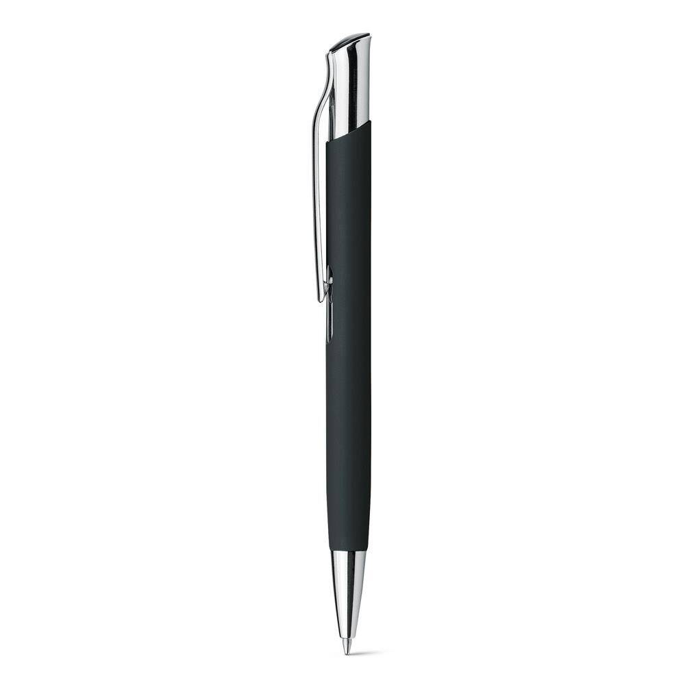 Aluminiowy długopis z gumowymi wykończeniami i klipem.