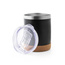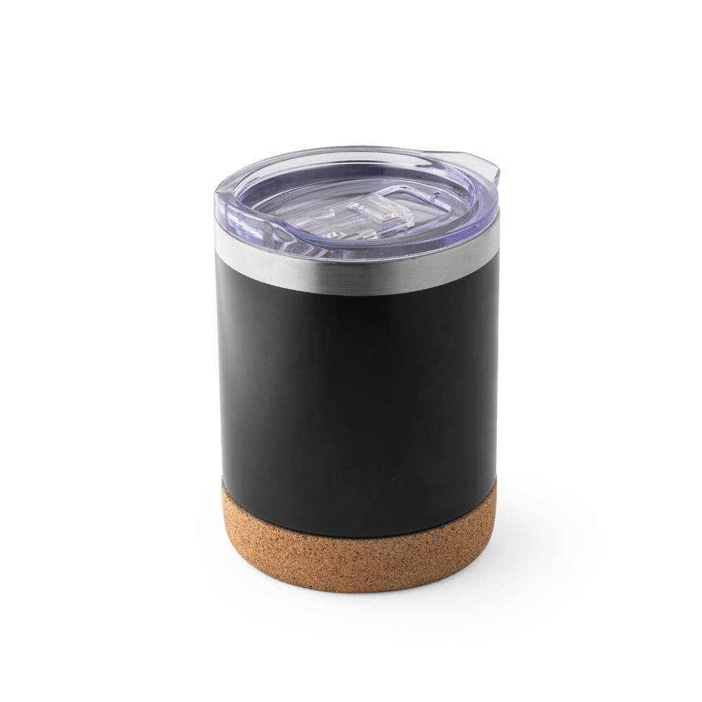 Kubek podróżny ze stali nierdzewnej izolowany próżniowo o podwójnych ściankach o matowym wykończeniu, z korkową podstawą. Zawiera przezroczystą pokrywę z przesuwnym zamknięciem. Pojemność do 400 mL. Dostarczane w pudełku kraft. Ø93 x 121 mm