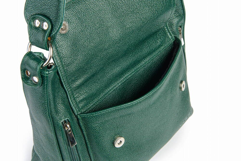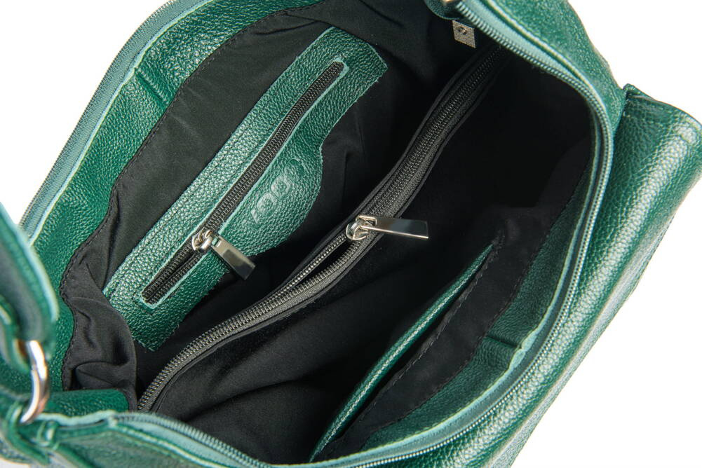 Posiada dwie przestronne komory przedzielone kieszenią zapinaną na zamek.