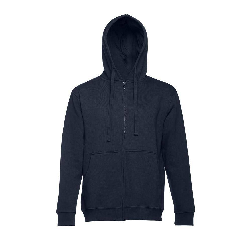 Męska bluza z kapturem zapinana na suwak. 50% bawełna i 50% poliester (320 g/m²) ze zgrzebnym wnętrzem. Kaptur jest podszyty i posiada kolorowy sznurek do ściągania. Bluza ma 2 kieszenie kangurkowe i kryty plastikowy zamek błyskawiczny. Fason ze ściągaczami przy mankietach i na dole. Rozmiary: S, M, L, XL, XXL