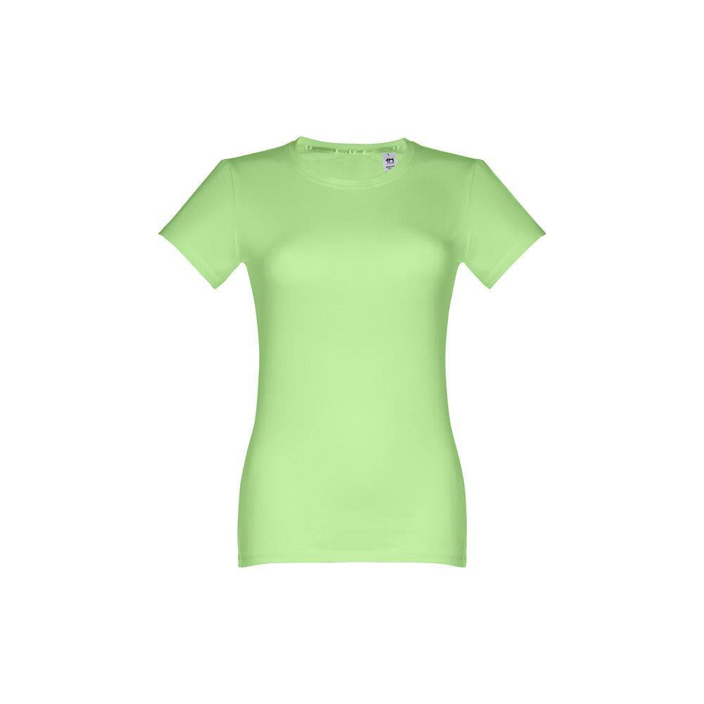 Damski t-shirt o dopasowanym kroju. 100% bawełna dżersej (190 g/m²) ze zgrzebną przędzą bawełnianą (kolor 183: 90% bawełna/10% wiskoza). Posiada cienki kołnierzyk z dżerseju wzmocniony satynową tasiemką. Zszywany po bokach, z podwójnym ściegiem na rękawach i na dole. Rozmiary: S, M, L, XL, XXL