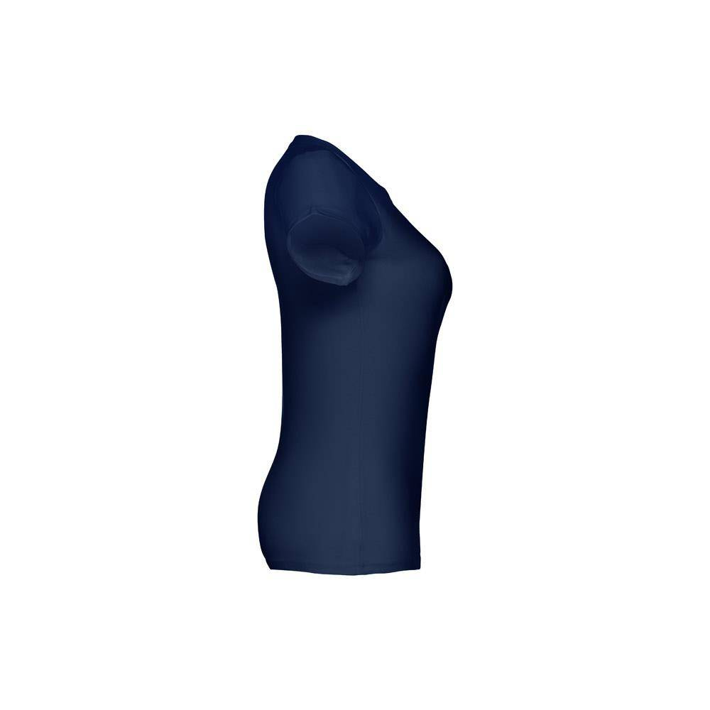 Damski t-shirt o dopasowanym kroju. 100% bawełna dżersej (190 g/m²) ze zgrzebną przędzą bawełnianą (kolor 183: 90% bawełna/10% wiskoza). Posiada cienki kołnierzyk z dżerseju wzmocniony satynową tasiemką. Zszywany po bokach, z podwójnym ściegiem na rękawach i na dole. Rozmiary: S, M, L, XL, XXL