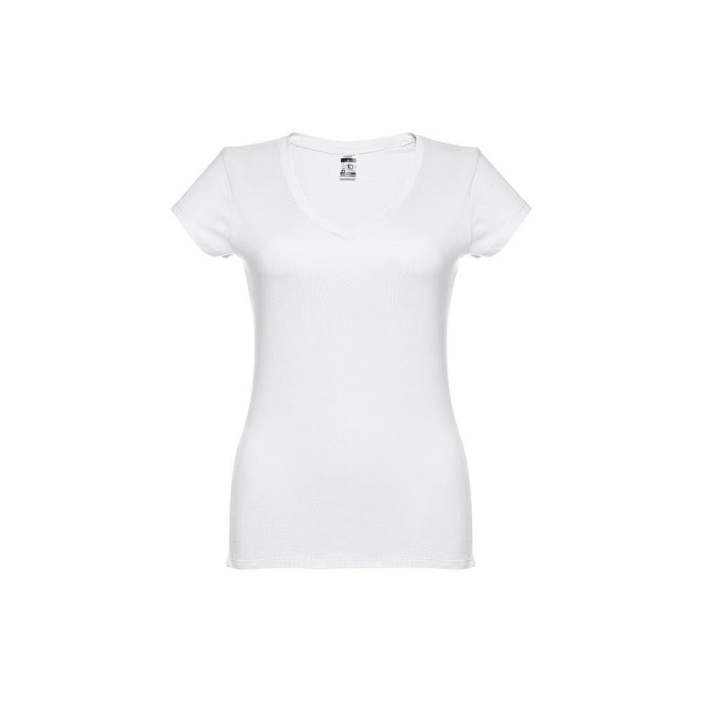 Damski t-shirt o dopasowanym kroju. 100% bawełna dżersej (150 g/m²) ze zgrzebną przędzą bawełnianą. Posiada kołnierzyk z dżerseju z dekoltem w kształcie litery „V”, wzmocniony od wewnątrz dżersejową tasiemką. Podwójne szwy na rękawach i dolnej części. Rozmiary: S, M, L, XL, XXL