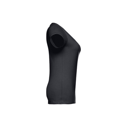 Damski t-shirt o dopasowanym kroju. 100% bawełna dżersej (150 g/m²) ze zgrzebną przędzą bawełnianą (kolory: 194, 195 i 199: 60% bawełna/40% poliester). Posiada kołnierzyk z dżerseju z dekoltem w kształcie litery „V”, wzmocniony od wewnątrz dżersejową tasiemką. Podwójne szwy na rękawach i dolnej części. Rozmiary: S, M, L, XL, XXL