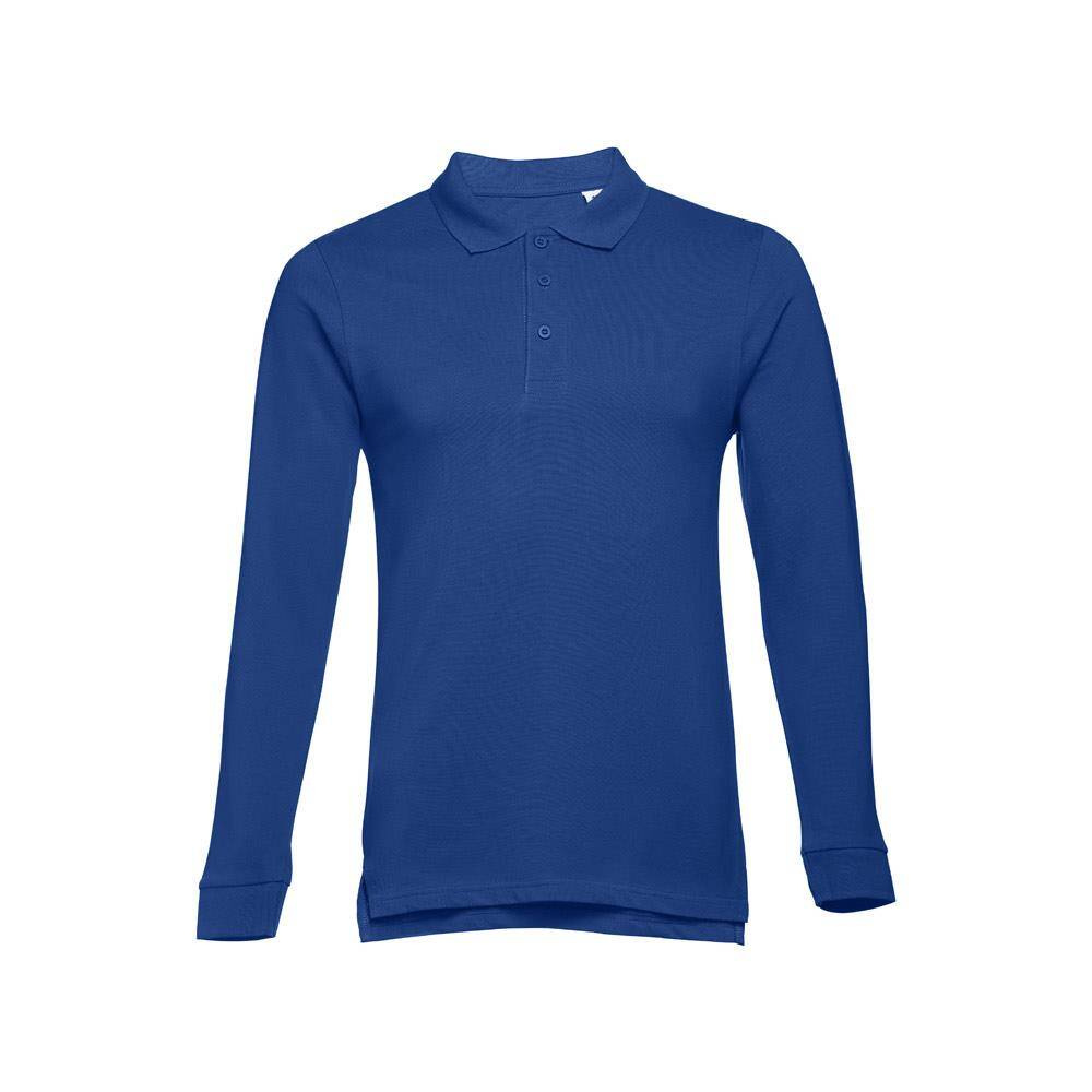 Męski t-shirt polo z długim rękawem ze 100% bawełny o splocie piqué (210 g/m²) ze zgrzebną przędzą bawełnianą (kolor 183: 85% bawełna/15% wiskoza). Polo o regularnym fasonie, z prążkowanym kołnierzykiem i rękawami. Kołnierzyk jest wzmocniony taśmą piqué. Posiada 3 dopasowane kolorystycznie guziki (dodatkowy guzik umieszczony w szwie wewnętrznym). Zszywany po bokach, z małymi rozcięciami w szwach bocznych. Zdejmowana widoczna etykieta. Rozmiary: S, M, L, XL, XXL