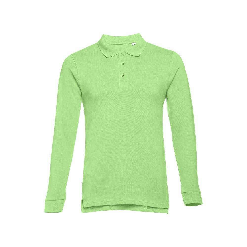 Męski t-shirt polo z długim rękawem ze 100% bawełny o splocie piqué (210 g/m²) ze zgrzebną przędzą bawełnianą (kolor 183: 85% bawełna/15% wiskoza). Polo o regularnym fasonie, z prążkowanym kołnierzykiem i rękawami. Kołnierzyk jest wzmocniony taśmą piqué. Posiada 3 dopasowane kolorystycznie guziki (dodatkowy guzik umieszczony w szwie wewnętrznym). Zszywany po bokach, z małymi rozcięciami w szwach bocznych. Zdejmowana widoczna etykieta. Rozmiary: S, M, L, XL, XXL