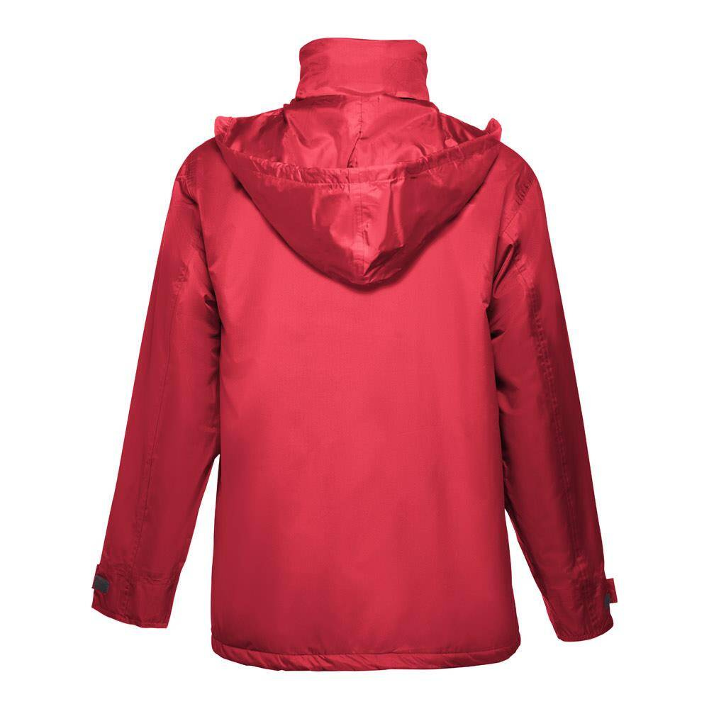 Uniwersalna wyściełana parka (unisex). 100% poliester. Zewnętrzna część: 100% poliester pongee 240 g/m² i wodoodporna powłoka PCV. Wnętrze: 100% poliester z tafty 65 g/m². Wypełnienie: 100% poliester 80 g/m². Obszyty czarnym polarem kołnierz (przylegające zapięcie). Chowany kaptur w kołnierzu, regulowany za pomocą ściągających sznurków z czarnymi stoperami. Przedni otwór z klapą, zamek błyskawiczny (pasujący kolorystycznie), przylegające zapięcie i zatrzaski w kolorze czarnym. 2 zewnętrzne kieszenie z patką i 2 wewnętrzne kieszenie (1 na telefon komórkowy) o przylegającym zamknięciu. Mankiety wewnętrzne z prążkowanej siatki 2x2. Regulowane mankiety zewnętrzne z przylegającym zapięciem. Termo-uszczelnione szwy. Wewnętrzny zamek błyskawiczny. Rozmiary: XS, S, M, L, XL, XXL
