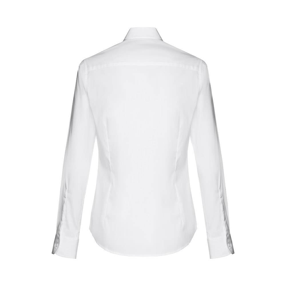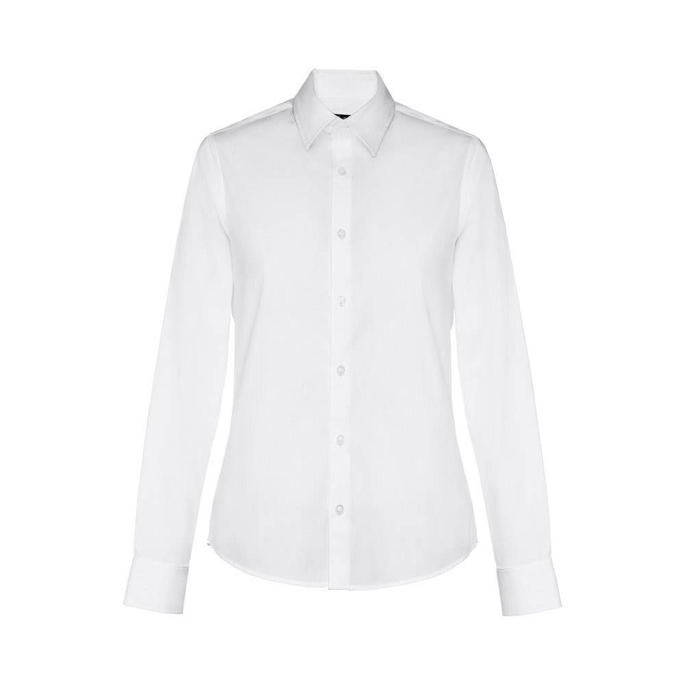 Damska koszula z długim rękawem. 68% bawełna, 28% poliamid i 4% elastan (115 g/m²). Długi rękaw z 1 zakładką i regulowanymi mankietami z 1 guzikiem. Dopasowana talia z 2 zaszewkami z tyłu i zapięciem na 7 pasujących kolorystycznie guzików. Rozmiary: S, M, L, XL, XXL