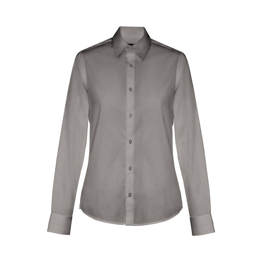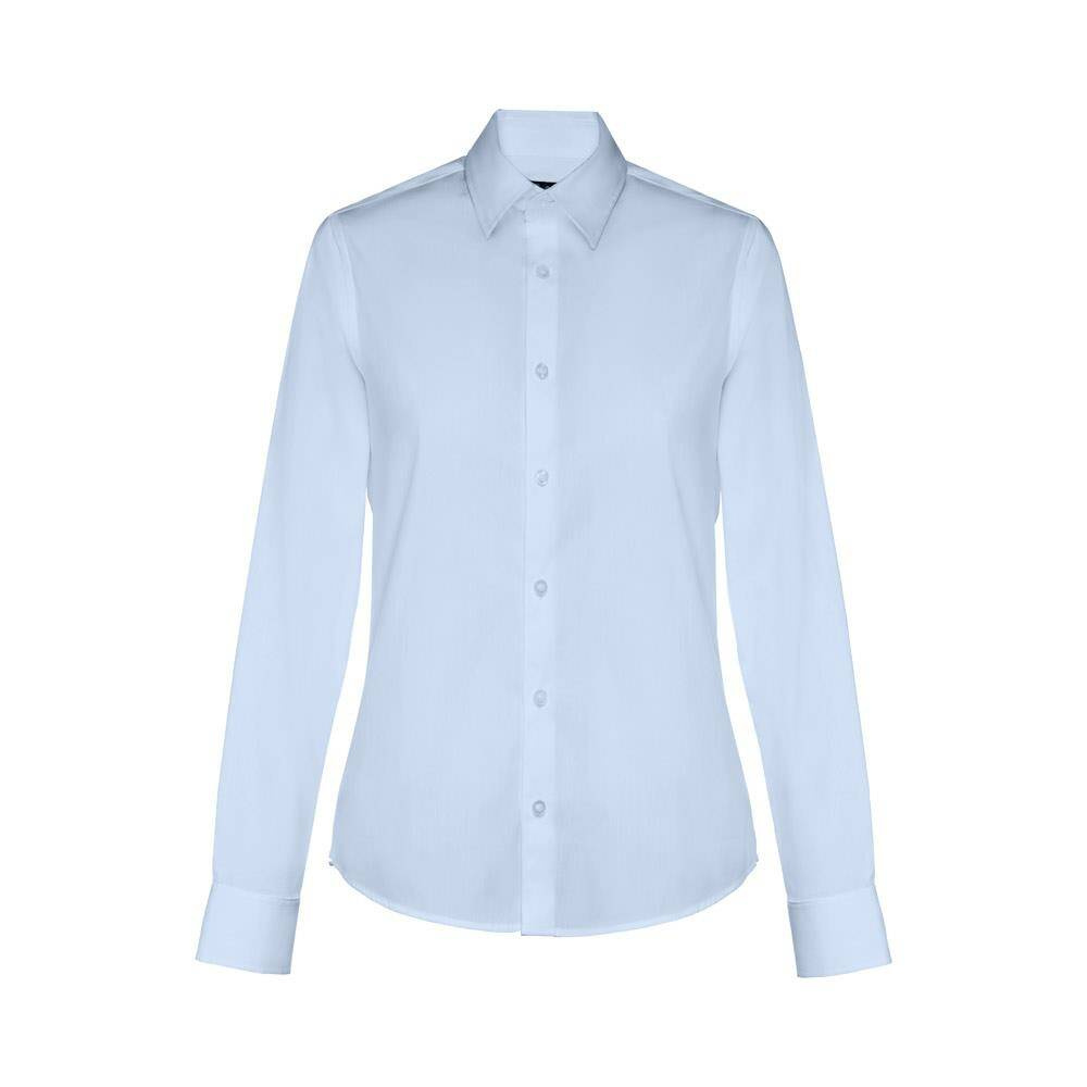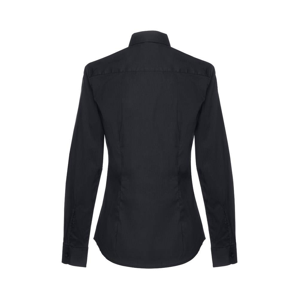 Damska koszula z długim rękawem. 68% bawełna, 28% poliamid i 4% elastan (115 g/m²). Długi rękaw z 1 zakładką i regulowanymi mankietami z 1 guzikiem. Dopasowana talia z 2 zaszewkami z tyłu i zapięciem na 7 pasujących kolorystycznie guzików. Rozmiary: S, M, L, XL, XXL