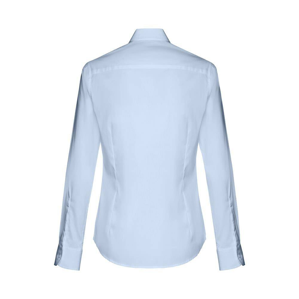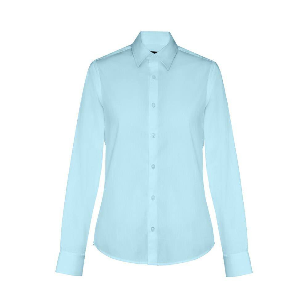 Damska koszula z długim rękawem. 68% bawełna, 28% poliamid i 4% elastan (115 g/m²). Długi rękaw z 1 zakładką i regulowanymi mankietami z 1 guzikiem. Dopasowana talia z 2 zaszewkami z tyłu i zapięciem na 7 pasujących kolorystycznie guzików. Rozmiary: S, M, L, XL, XXL