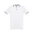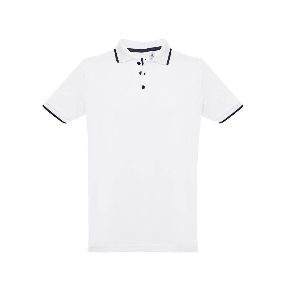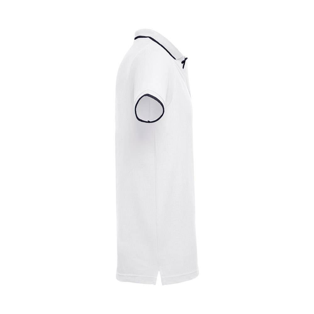 Męska dwukolorowa koszulka polo z krótkim rękawem, wykonana w 100% z bawełny zgrzebnej typu pique (210 g/m²). Dwukolorowy kontrast na kołnierzu, rękawie i plisie. Posiada prążkowane mankiety i kołnierz. Wzmocniona plisa z 3 kontrastującymi kolorami guzików (dodatkowy guzik umieszczony w wewnętrznym szwie bocznym). Dopasowana talia i małe boczne rozcięcia na dole. Rozmiary: S, M, L, XL, XXL