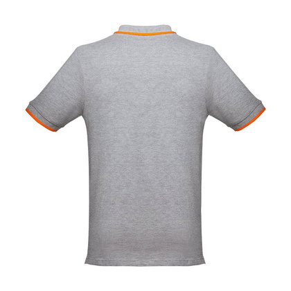 Męska dwukolorowa koszulka polo z krótkim rękawem, wykonana w 100% z bawełny zgrzebnej typu pique (210 g/m²) (kolor 183: 85% bawełna/15% wiskoza). Dwukolorowy kontrast na kołnierzu, rękawie i plisie. Posiada prążkowane mankiety i kołnierz. Wzmocniona plisa z 3 kontrastującymi kolorami guzików (dodatkowy guzik umieszczony w wewnętrznym szwie bocznym). Dopasowana talia i małe boczne rozcięcia na dole. Rozmiary: S, M, L, XL, XXL