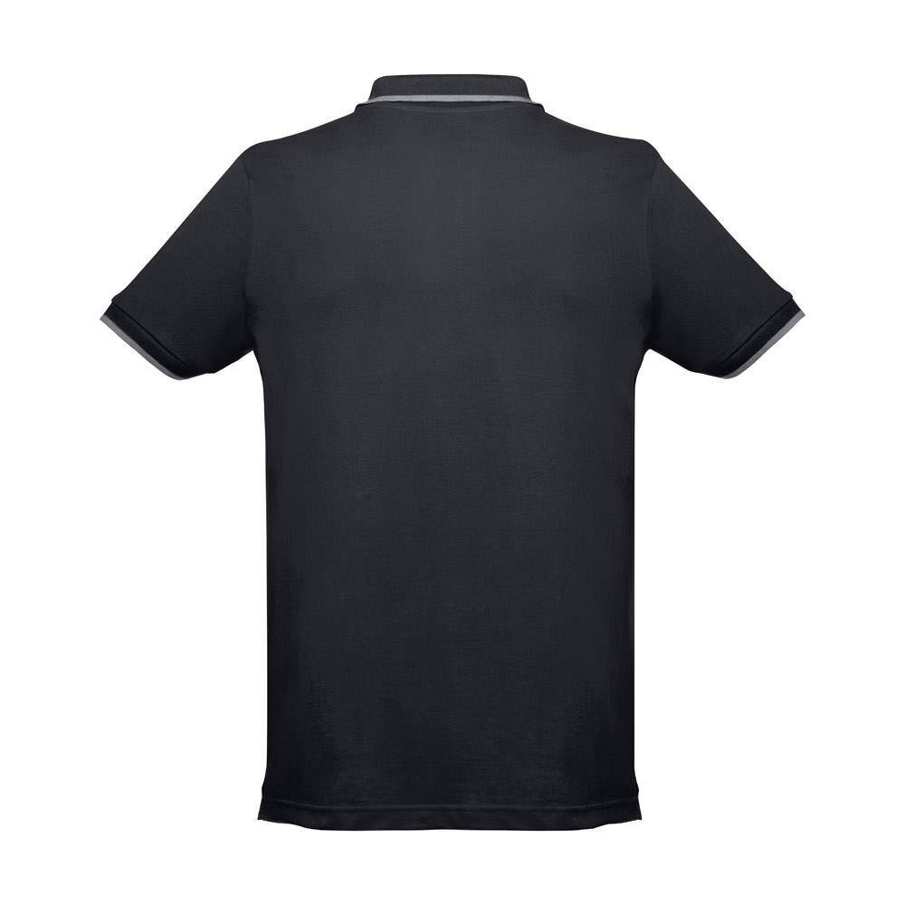 Męska dwukolorowa koszulka polo z krótkim rękawem, wykonana w 100% z bawełny zgrzebnej typu pique (210 g/m²) (kolor 183: 85% bawełna/15% wiskoza). Dwukolorowy kontrast na kołnierzu, rękawie i plisie. Posiada prążkowane mankiety i kołnierz. Wzmocniona plisa z 3 kontrastującymi kolorami guzików (dodatkowy guzik umieszczony w wewnętrznym szwie bocznym). Dopasowana talia i małe boczne rozcięcia na dole. Rozmiary: S, M, L, XL, XXL
