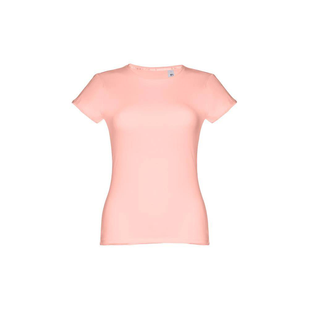 T-shirt damski o dopasowanym kroju ze 100% bawełnianego jerseyu (150 g/m²) z przędzą bawełnianą (kolor 183: 90% bawełna/10% wiskoza). Ma cienki kołnierz z podwójnej dzianiny wzmocniony satynową taśmą lamówką. Skrojona i zszyta odzież z podwójnym szwem na rękawach i u dołu. Rozmiar: 3XL