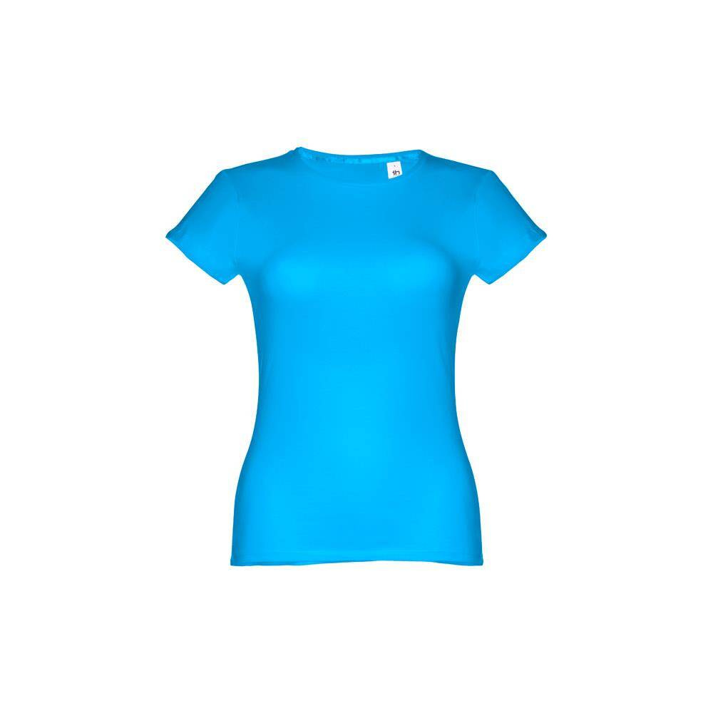 T-shirt damski o dopasowanym kroju ze 100% bawełnianej dzianiny jersey (150 g/m²) ze zgrzebną przędzą bawełnianą (kolor 183: 90% bawełna/10% wiskoza, kolor 196: 98% bawełna/2% wiskoza). Posiada cienki podwójny kołnierz z dżerseju wzmocniony satynową taśmą skośną. Skrojony i zszyty, z podwójnym szwem na rękawach i u dołu. Rozmiary: S, M, L, XL, XXL