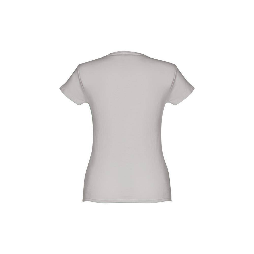 T-shirt damski o dopasowanym kroju ze 100% bawełnianej dzianiny jersey (150 g/m²) ze zgrzebną przędzą bawełnianą (kolor 183: 90% bawełna/10% wiskoza, kolor 196: 98% bawełna/2% wiskoza). Posiada cienki podwójny kołnierz z dżerseju wzmocniony satynową taśmą skośną. Skrojony i zszyty, z podwójnym szwem na rękawach i u dołu. Rozmiary: S, M, L, XL, XXL