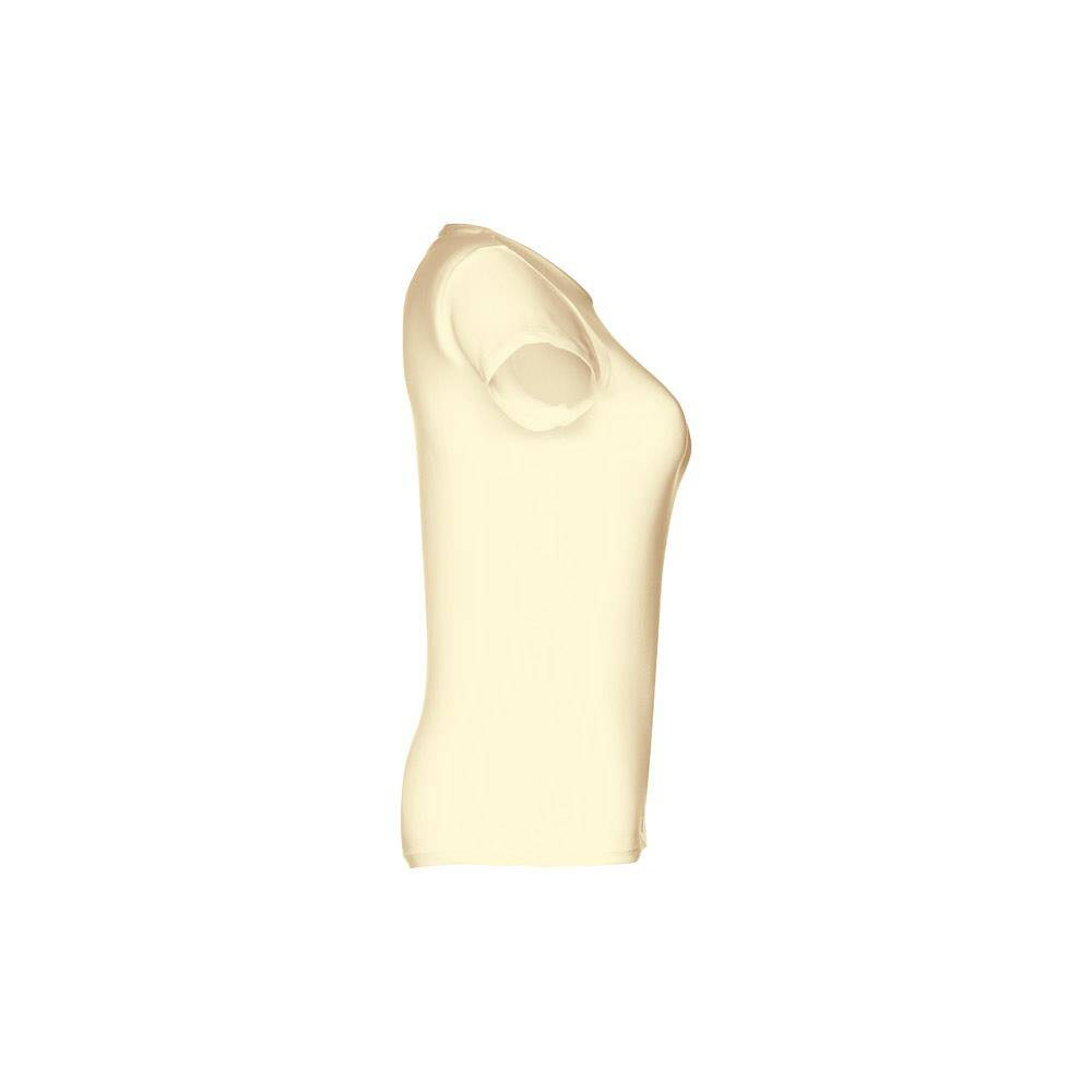 T-shirt damski o dopasowanym kroju ze 100% bawełnianej dzianiny jersey (150 g/m²) ze zgrzebną przędzą bawełnianą (kolor 183: 90% bawełna/10% wiskoza, kolor 196: 98% bawełna/2% wiskoza). Posiada cienki podwójny kołnierz z dżerseju wzmocniony satynową taśmą skośną. Skrojony i zszyty, z podwójnym szwem na rękawach i u dołu. Rozmiary: S, M, L, XL, XXL