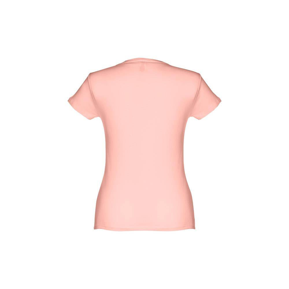 T-shirt damski o dopasowanym kroju ze 100% bawełnianej dzianiny jersey (150 g/m²) ze zgrzebną przędzą bawełnianą (kolor 183: 90% bawełna/10% wiskoza, kolor 196: 98% bawełna/2% wiskoza). Posiada cienki podwójny kołnierz z dżerseju wzmocniony satynową taśmą skośną. Skrojony i zszyty, z podwójnym szwem na rękawach i u dołu. Rozmiary: S, M, L, XL, XXL