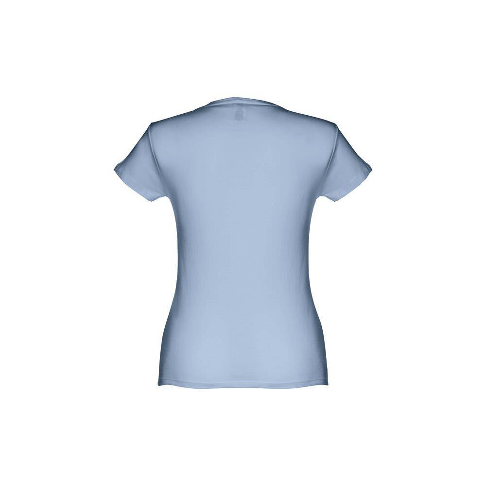 T-shirt damski o dopasowanym kroju ze 100% bawełnianej dzianiny jersey (150 g/m²) ze zgrzebną przędzą bawełnianą (kolor 183: 90% bawełna/10% wiskoza, kolor 196: 98% bawełna/2% wiskoza). Posiada cienki podwójny kołnierz z dżerseju wzmocniony satynową taśmą skośną. Skrojony i zszyty, z podwójnym szwem na rękawach i u dołu. Rozmiary: S, M, L, XL, XXL