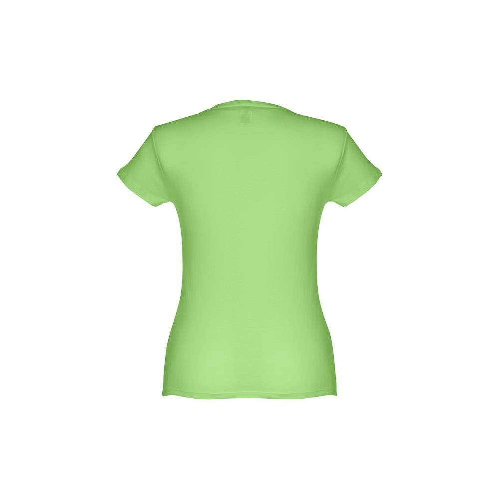 T-shirt damski o dopasowanym kroju ze 100% bawełnianej dzianiny jersey (150 g/m²) ze zgrzebną przędzą bawełnianą (kolor 183: 90% bawełna/10% wiskoza, kolor 196: 98% bawełna/2% wiskoza). Posiada cienki podwójny kołnierz z dżerseju wzmocniony satynową taśmą skośną. Skrojony i zszyty, z podwójnym szwem na rękawach i u dołu. Rozmiary: S, M, L, XL, XXL