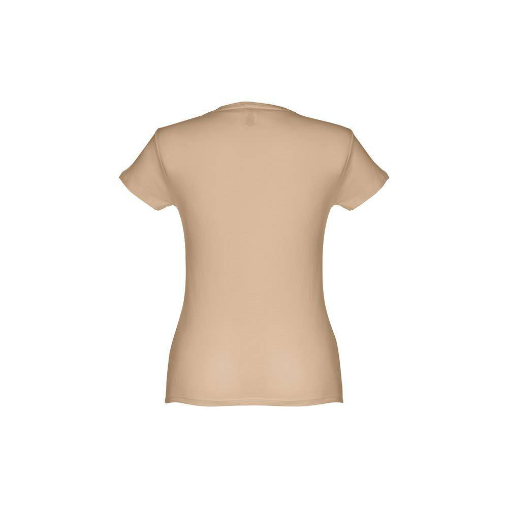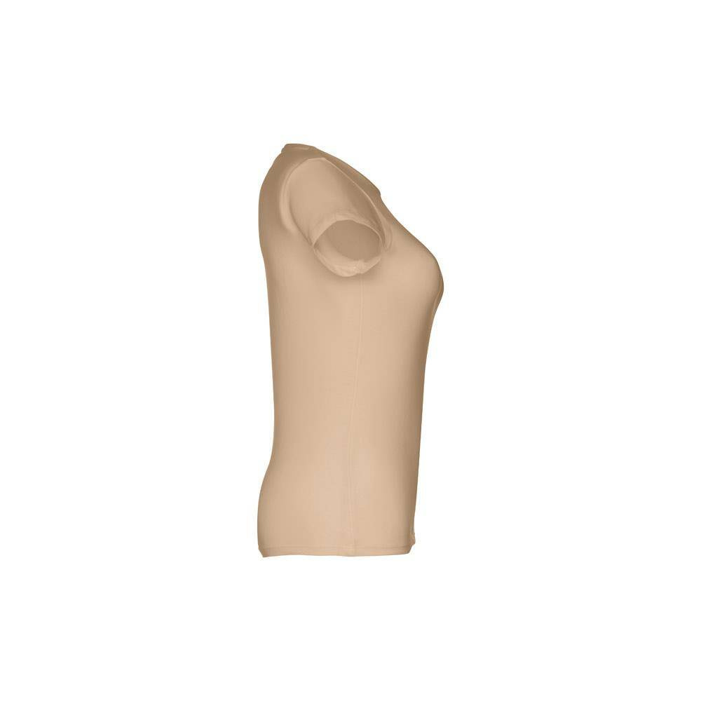 T-shirt damski o dopasowanym kroju ze 100% bawełnianej dzianiny jersey (150 g/m²) ze zgrzebną przędzą bawełnianą (kolor 183: 90% bawełna/10% wiskoza, kolor 196: 98% bawełna/2% wiskoza). Posiada cienki podwójny kołnierz z dżerseju wzmocniony satynową taśmą skośną. Skrojony i zszyty, z podwójnym szwem na rękawach i u dołu. Rozmiary: S, M, L, XL, XXL