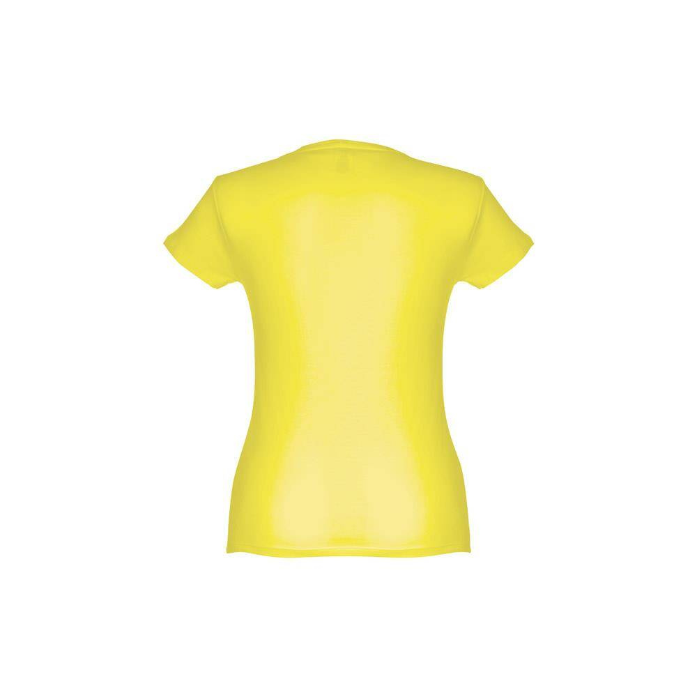 T-shirt damski o dopasowanym kroju ze 100% bawełnianej dzianiny jersey (150 g/m²) ze zgrzebną przędzą bawełnianą (kolor 183: 90% bawełna/10% wiskoza, kolor 196: 98% bawełna/2% wiskoza). Posiada cienki podwójny kołnierz z dżerseju wzmocniony satynową taśmą skośną. Skrojony i zszyty, z podwójnym szwem na rękawach i u dołu. Rozmiary: S, M, L, XL, XXL