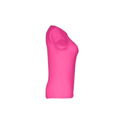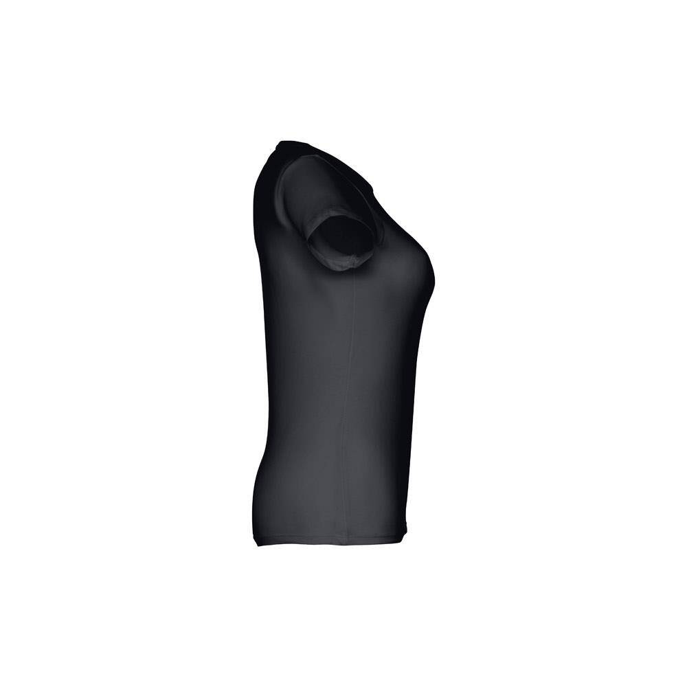 T-shirt damski o dopasowanym kroju ze 100% bawełnianej dzianiny jersey (150 g/m²) ze zgrzebną przędzą bawełnianą (kolor 183: 90% bawełna/10% wiskoza, kolor 196: 98% bawełna/2% wiskoza). Posiada cienki podwójny kołnierz z dżerseju wzmocniony satynową taśmą skośną. Skrojony i zszyty, z podwójnym szwem na rękawach i u dołu. Rozmiary: S, M, L, XL, XXL