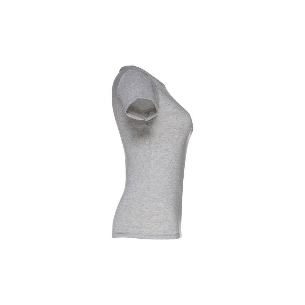 T-shirt damski o dopasowanym kroju ze 100% bawełnianej dzianiny jersey (150 g/m²) ze zgrzebną przędzą bawełnianą (kolor 183: 90% bawełna/10% wiskoza, kolor 196: 98% bawełna/2% wiskoza). Posiada cienki podwójny kołnierz z dżerseju wzmocniony satynową taśmą skośną. Skrojony i zszyty, z podwójnym szwem na rękawach i u dołu. Rozmiary: S, M, L, XL, XXL