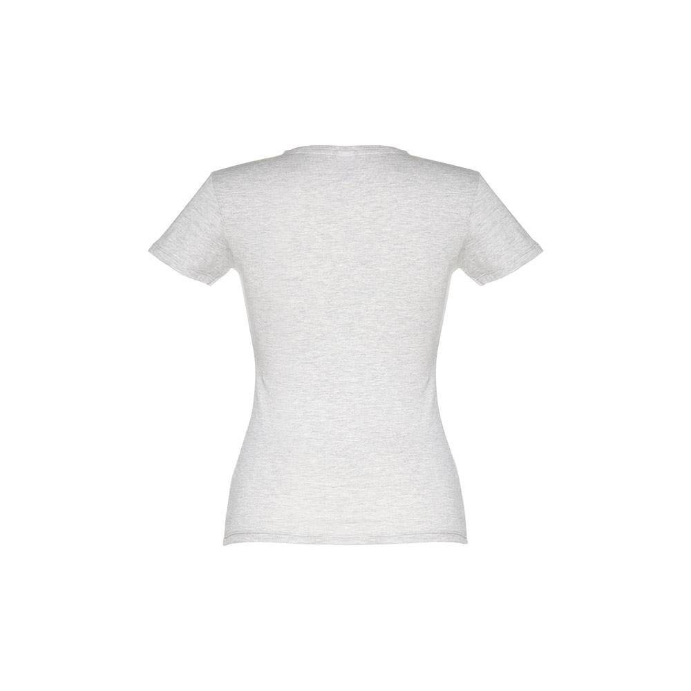 T-shirt damski o dopasowanym kroju ze 100% bawełnianej dzianiny jersey (150 g/m²) ze zgrzebną przędzą bawełnianą (kolor 183: 90% bawełna/10% wiskoza, kolor 196: 98% bawełna/2% wiskoza). Posiada cienki podwójny kołnierz z dżerseju wzmocniony satynową taśmą skośną. Skrojony i zszyty, z podwójnym szwem na rękawach i u dołu. Rozmiary: S, M, L, XL, XXL