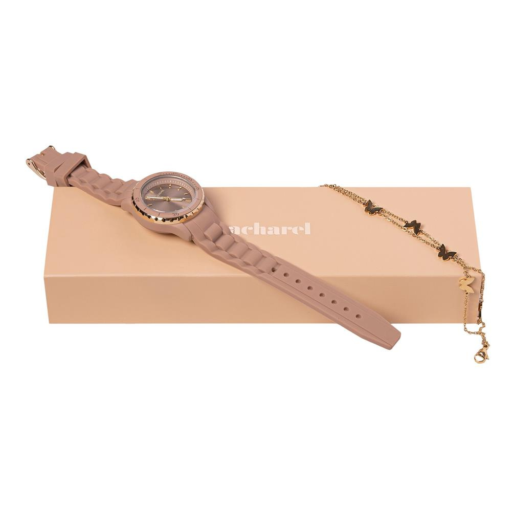 CJB376E - Bransoletka Albane to podwójny splot łańcuszków wzbogaconych o charakterystycznego dla Cacharel motyla.