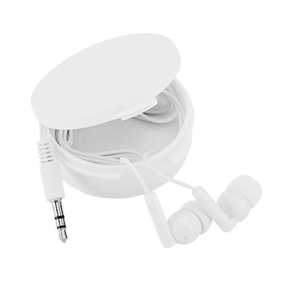 Słuchawki douszne zapakowane w plastikowe pudełko, z kablem 3,5 mm.