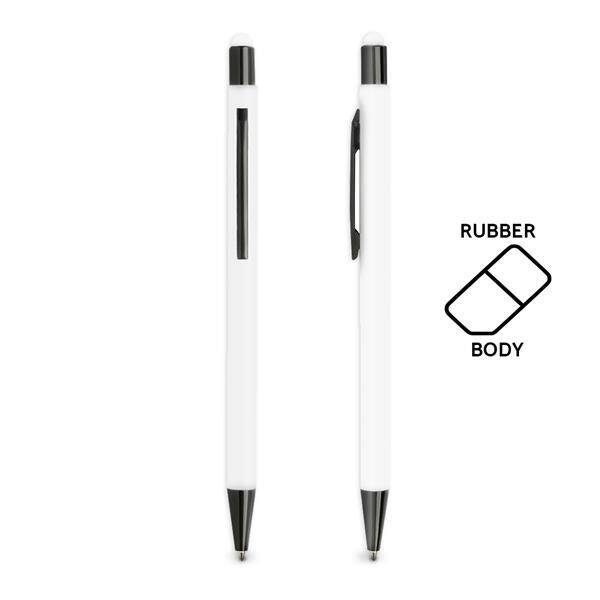 Długopis aluminiowy z gumką do obsługi ekranów dotykowych i gumowaną powierzchnią, z mechanizmem wciskanym, pisze na niebiesko.