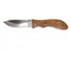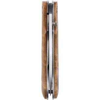 Nóż kieszonkowy, wykonany z metalu z drewnianą rękojeścią.