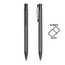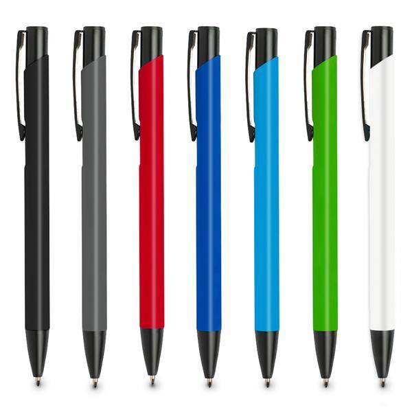 Długopis aluminiowy z gumowaną powierzchnią, z mechanizmem wciskanym, pisze na niebiesko.