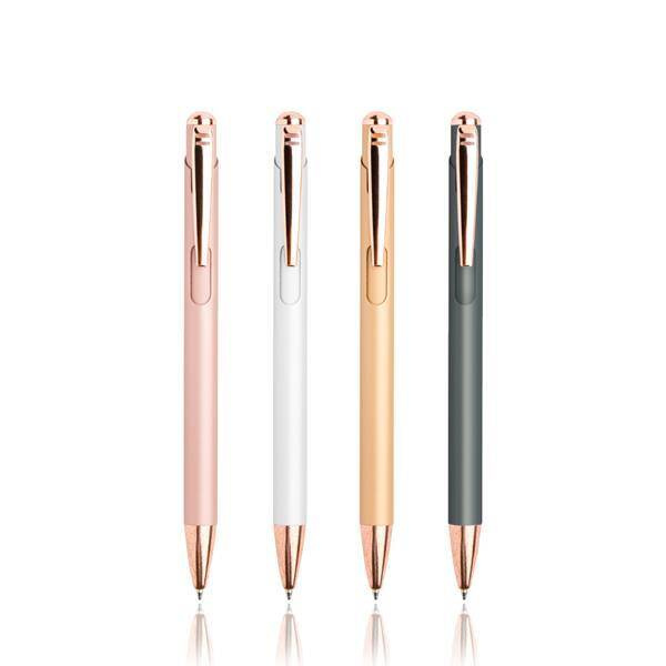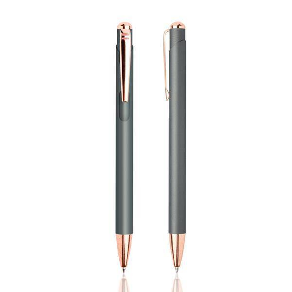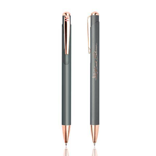 Długopis charakteryzuje się powierzchnią soft touch, posiada zdobienia w złotym odcieniu oraz załączony niebieski wkład piszący.