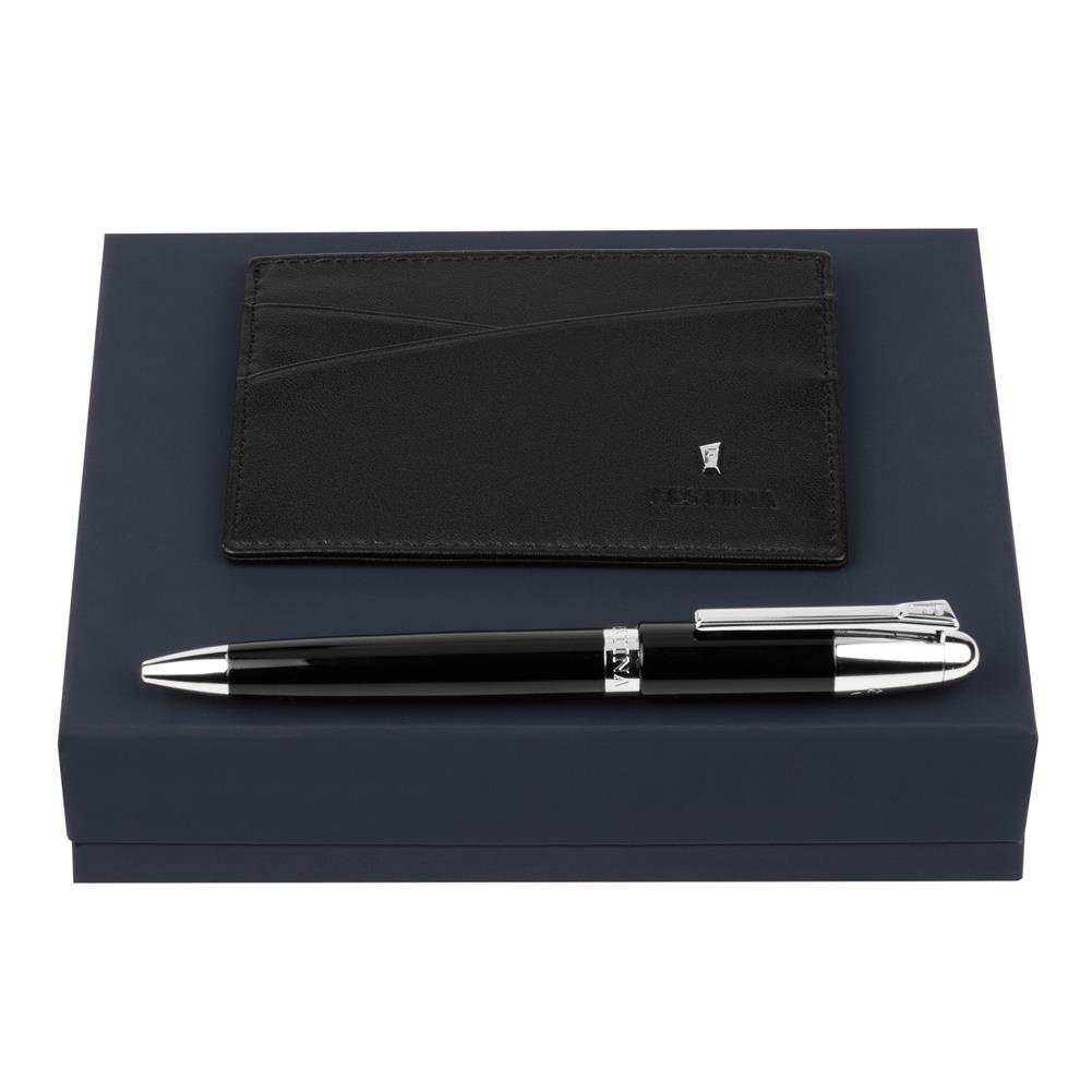 Stylowy zestaw złożony ze skórzanego etui na karty (4 przegródki) i piszącego na czarno długopisu.