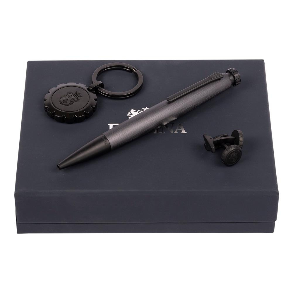 Spinki do mankietu wykonane są ze stali nierdzewnej i wykończone emalią, podobnie jak długopis i brelok.