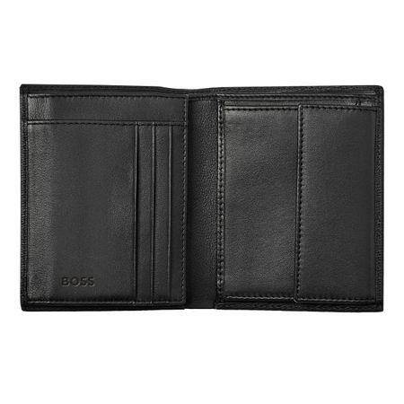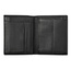 Ten pionowy portfel z klapką i kieszenią na monety jest wykonany ze starannie dobranej, czarnej, teksturowanej skóry.