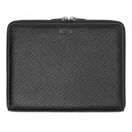 Jednocześnie odważne i dyskretne, nasze teczki z monogramem są wykonane z niestandardowego materiału, delikatnie wytłoczonego kultowym wzorem BOSS. Podpisana tabliczką BOSS luksusowo wykończoną ciemnym chromem, teczka ta stanowi idealny zestaw z długopisami z naszej kolekcji instrumentów piśmiennych. Wersja zapinana na zamek błyskawiczny jest dodatkowo wzbogacona o sygnowane metalowe pullery BOSS. Dostępny w formatach A4 i A5.